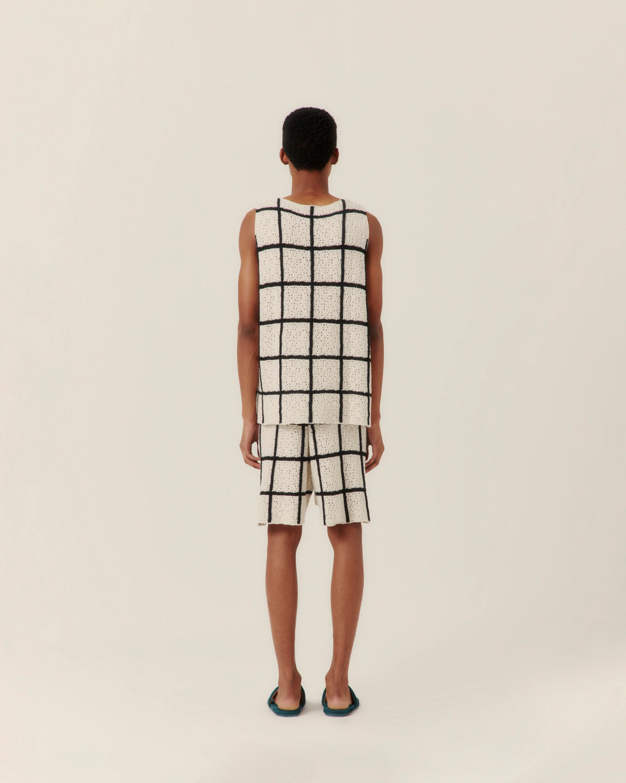 Crochet knit tank in cotton and wool with check motif.