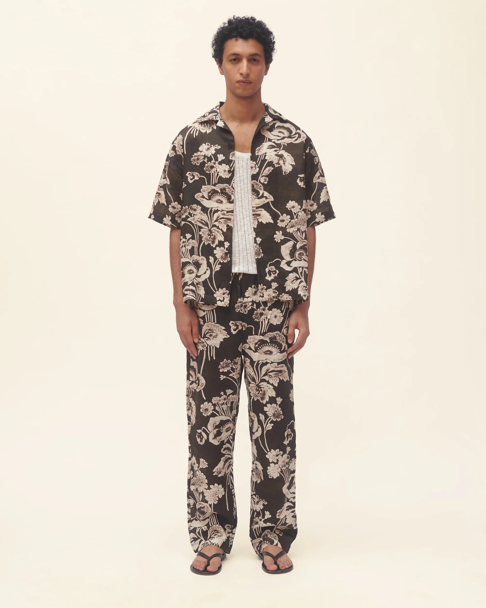 Linen trousers featuring a hand-painted peony print, inspired by a rare 250-year-old Japanese blanket sourced in Paris.